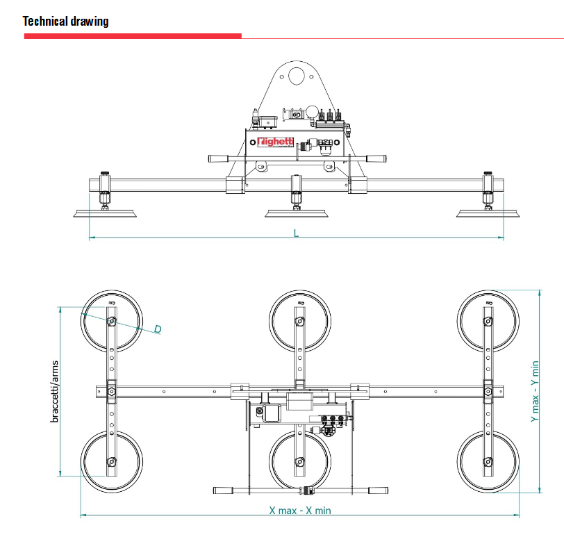 Adjusting the position of the pads and arms allows you to adapt the vacuum lifter to the different sizes and shapes of the sheets metal.