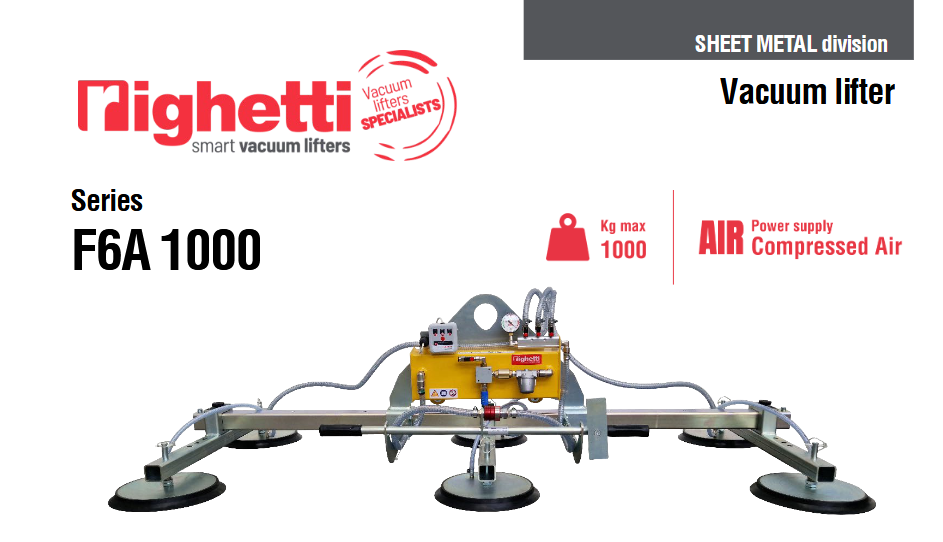 The Vacuum Lifter for sheets metal F6A 1000 is a model with compressed air operating system and requires connection to the pneumatic system.