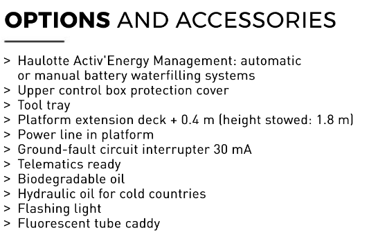 - Haulotte Activ'Energy Management: automatic or manual battery waterfilling systems