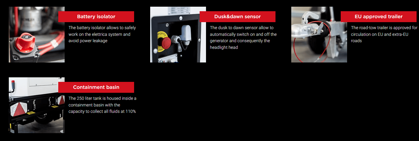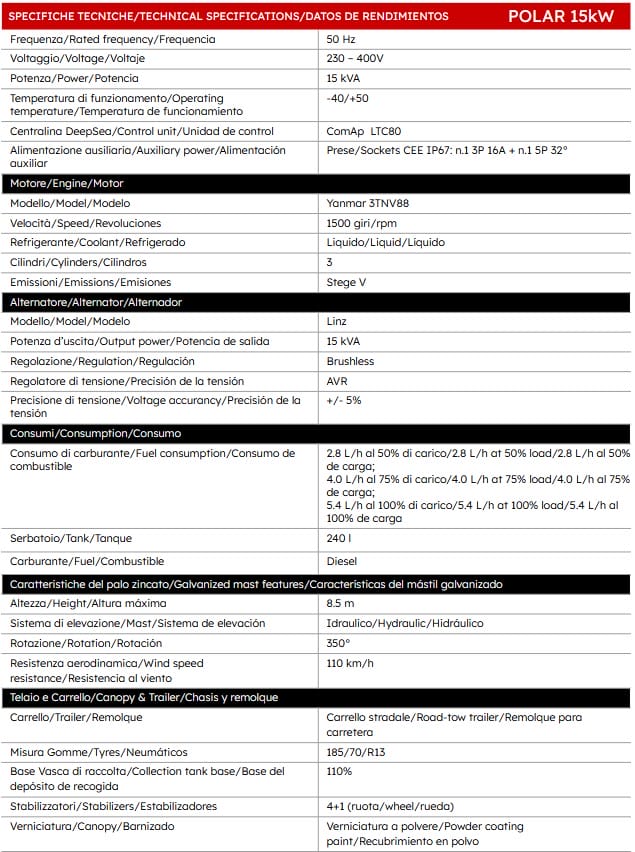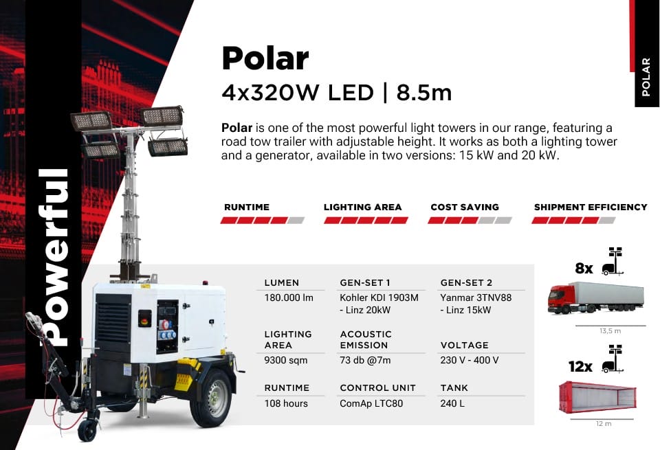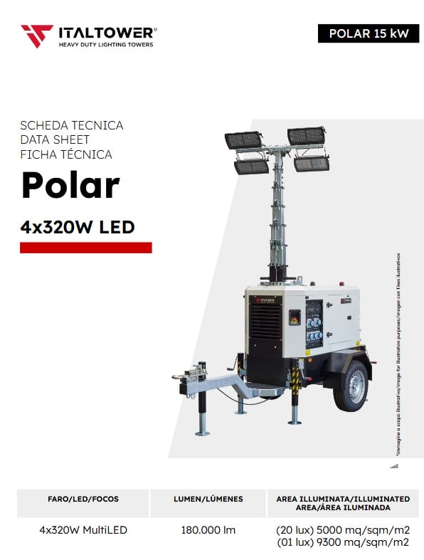 Its 20 kVA alternator and 250 liter tank make Polar a unique lighting tower in terms of performances.