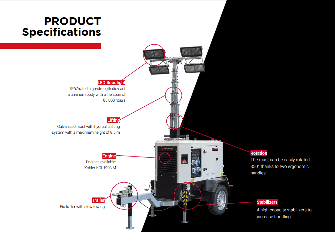- ITALTOWER LIGHTING TOWER WITH POWER GENERATOR & HYDRAULIC LIFTING SYSTEM POLAR UP TO 8.5M ILLUMINATED AREA 9300SQM