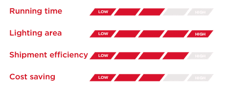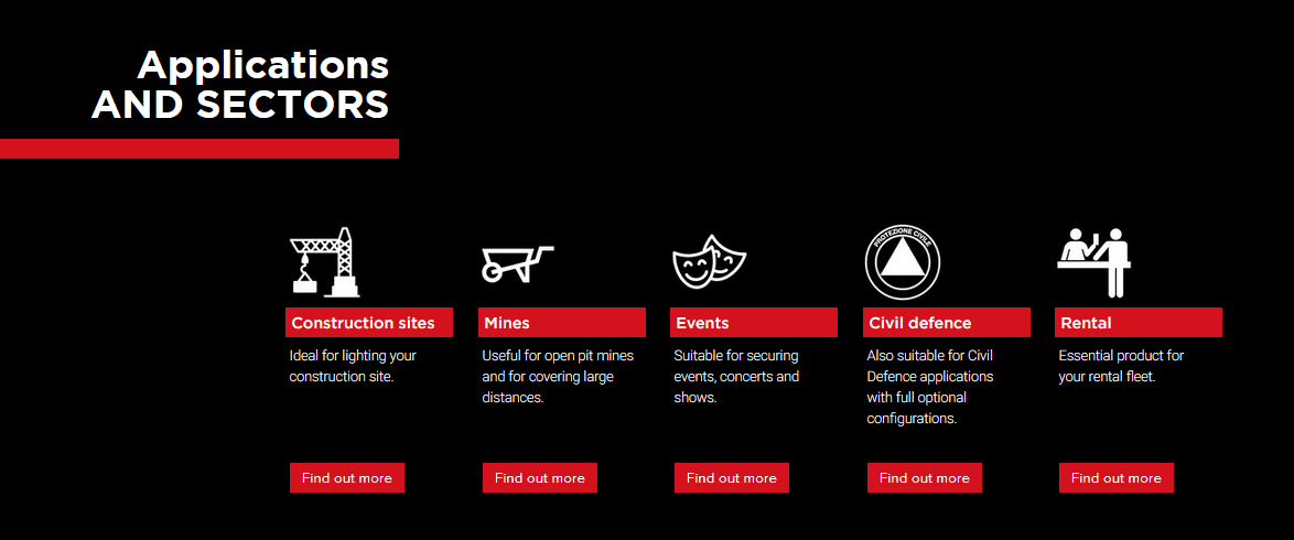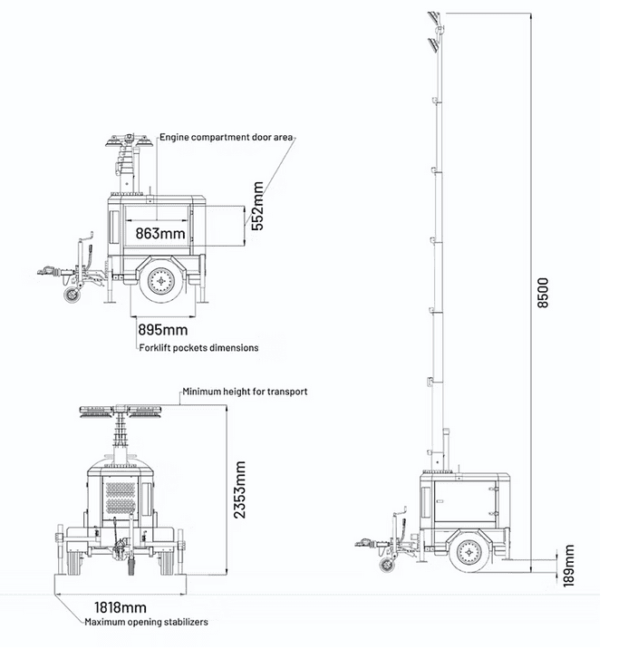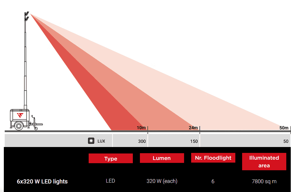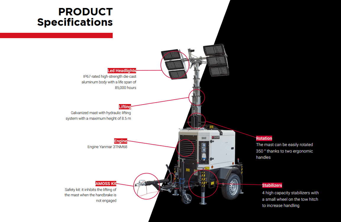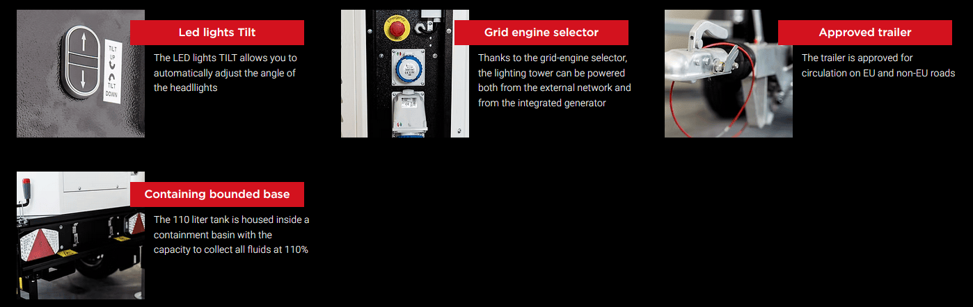 These are the strengths of our best-selling model. Thanks to its generator Stage V it is able to lower consumption by 70% and in the same way reduce CO2 emissions by more than 800 kg per month compared to traditional lighting towers on the market.