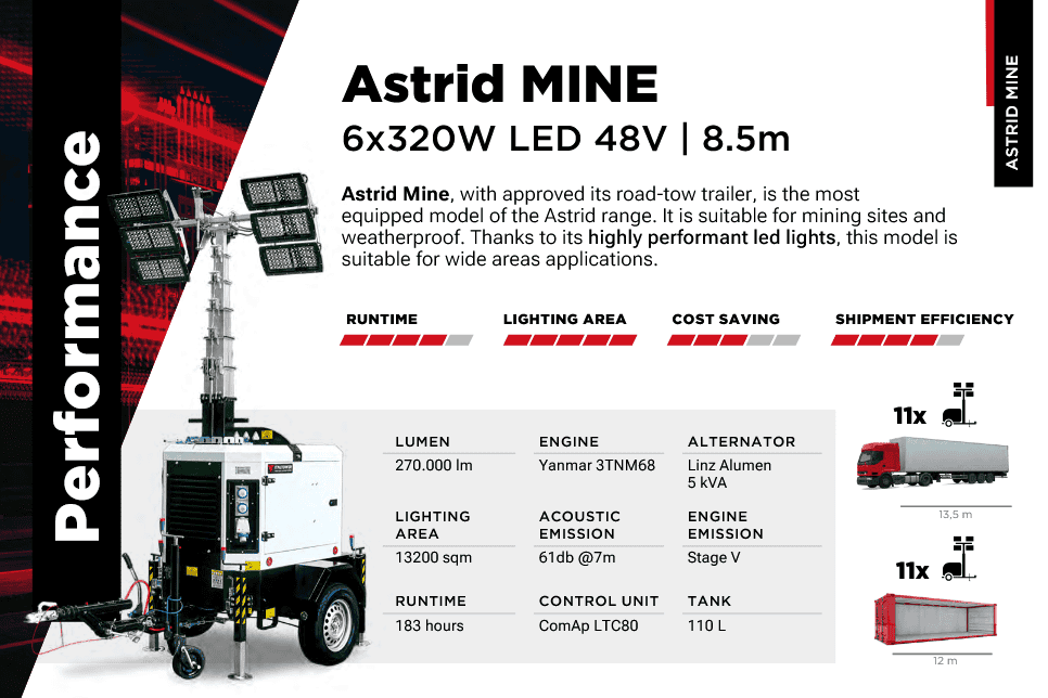 ASTRID MINE it is the most complete model of the ASTRID range, thanks to all the optionals already included as standard. Suitable for mining sites, weatherproof.