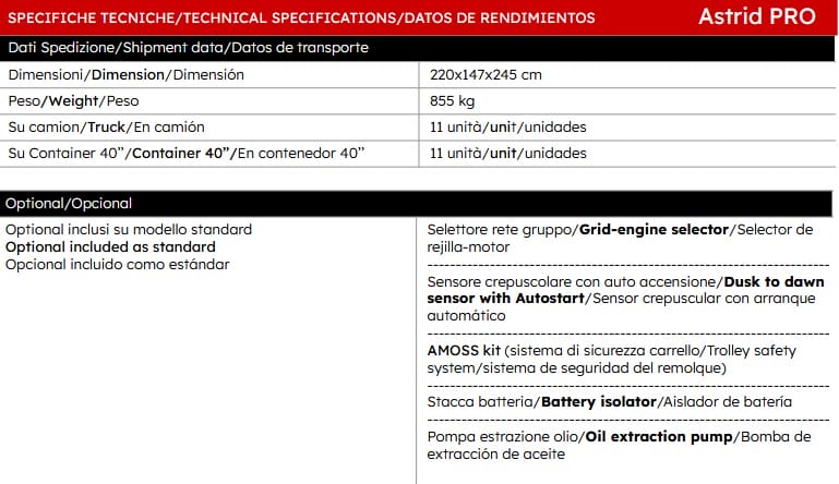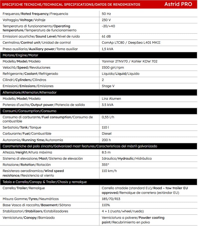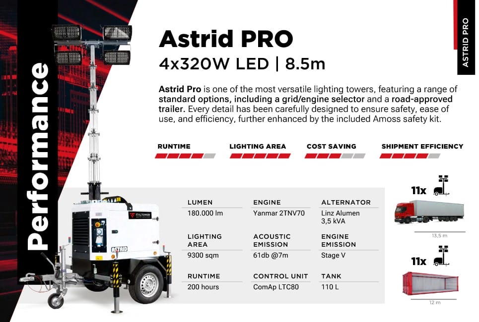 ASTRID PRO is one of the most versatile lighting towers in our range thanks to a series of optionals included as standard.