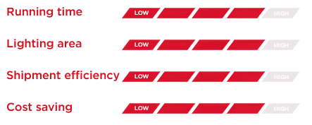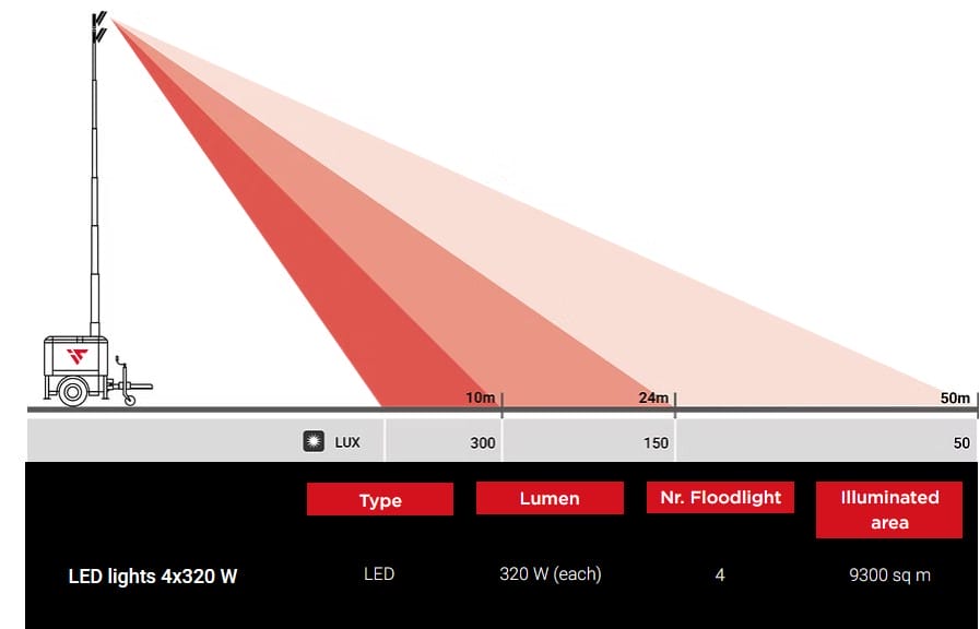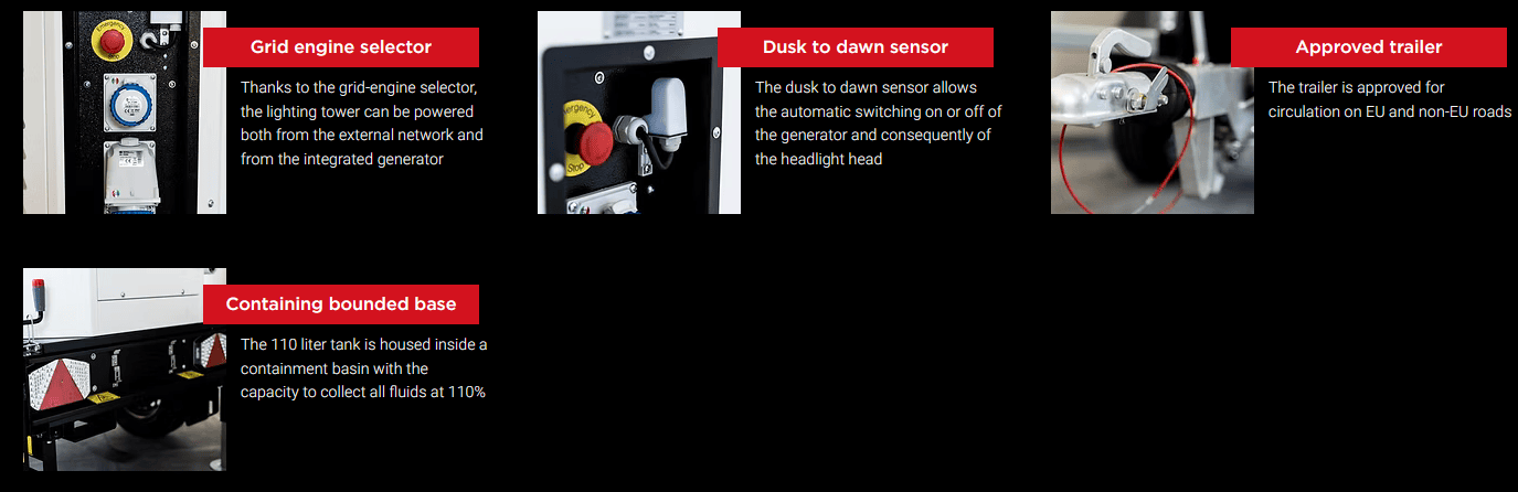 Thanks to the Stage V generator its consumption is 70% lower and CO2 emissions are reduced by more than 800 kg per month compared to traditional lighting towers on the market.