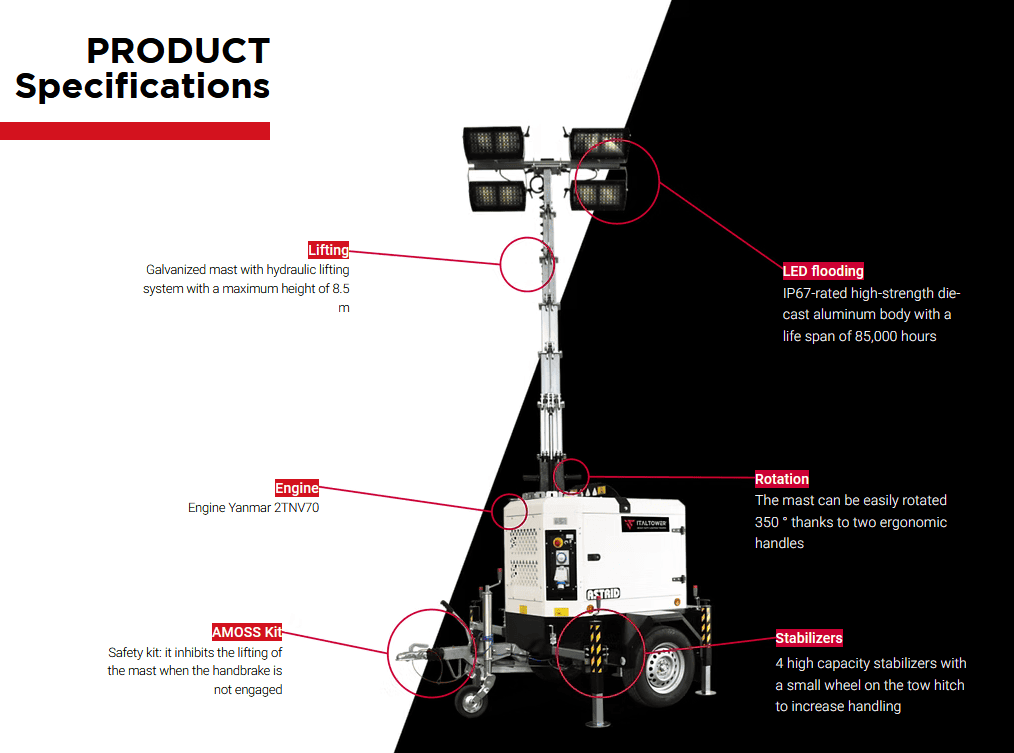 - ITALTOWER LIGHTING TOWER WITH POWER GENERATOR & HYDRAULIC LIFTING SYSTEM ASTRID PRO UP TO 8.5M ILLUMINATED AREA 9300SQM