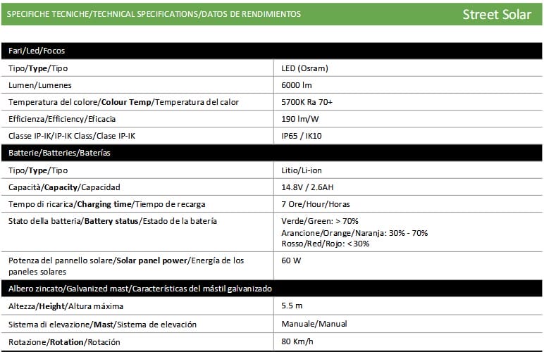 STREET SOLAR is the new LED lighting tower with 60 W solar panel and a battery pack from the green range.