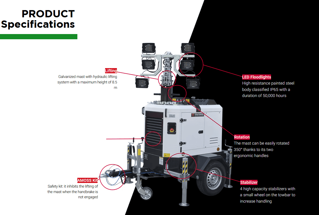 - ITALTOWER LIGHTING TOWER WITH BATTERY LITHIUM ASTRID HYBRID 8.5M ILLUMINATED AREA 4400SQM
