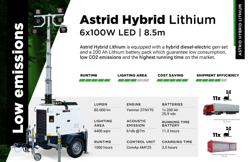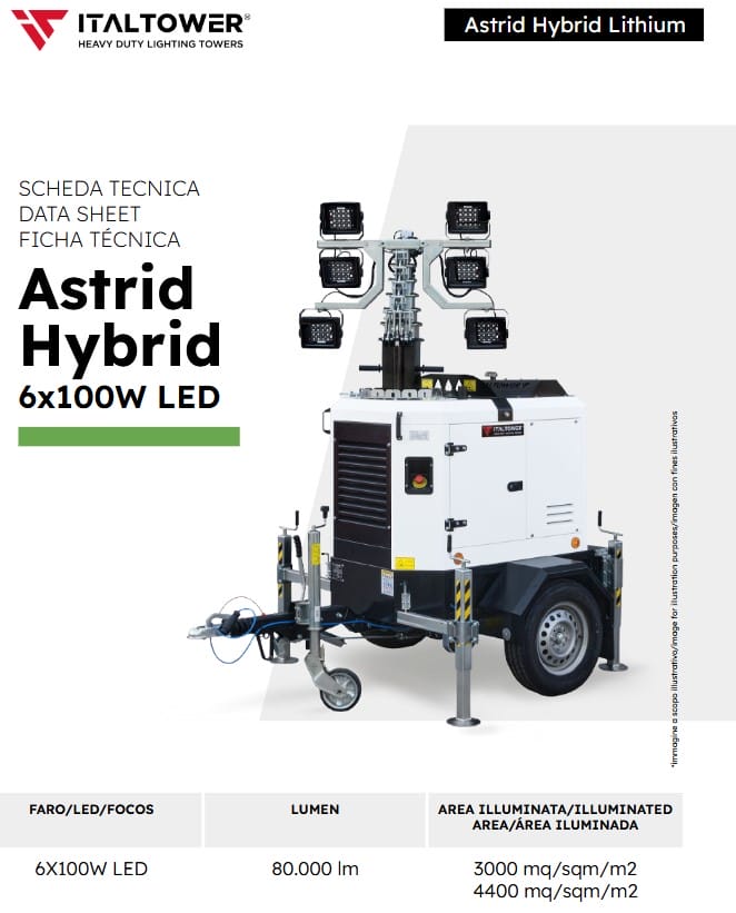ASTRID HYBRID - Lithium is the lighting tower that combines high efficiency and reliability with a reduced ecological impact.