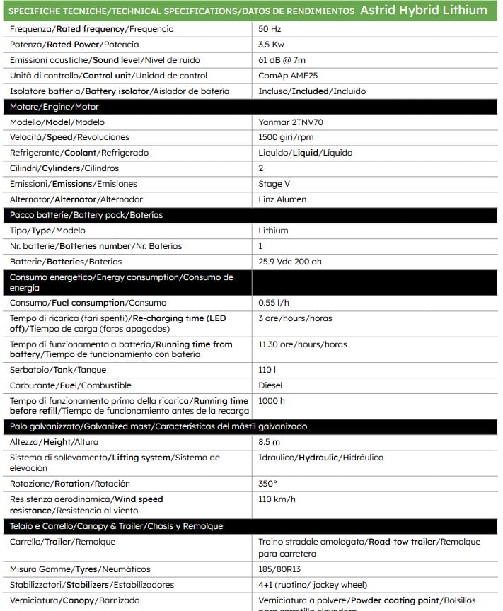 Inspired by the best-selling Astrid model, the Astrid Hybrid is the light tower equipped with a hybrid diesel-electric power unit with a 200 Ah Lithium battery that guarantees low consumption, low CO2 emissions and at the same time doubles its autonomy.