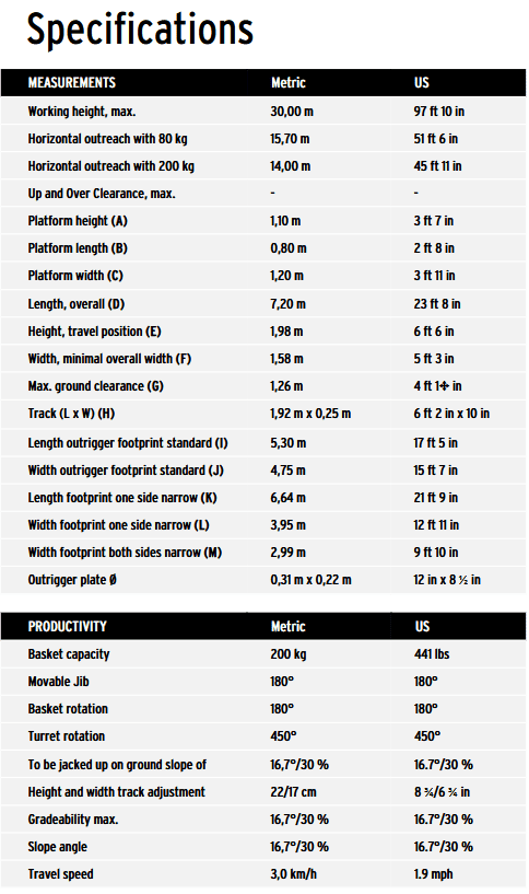 X20J PLUS Platform• 0.69 m x 1.30 m Aluminium 2 person platform• Slide bar rear entry• Footswitch• Full proportional control• Articulating jib• ..
