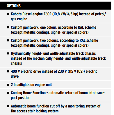 The track drive with non-marking rubber tracks provides easy, precise maneuvering and protects sensitive flooring. As a standard feature the LEO21GT is equipped with the mechanically height- and width adjustable track drive: The narrow setting decreases the width of the machine, in wide it increases ground clearance and stability. Also levelled driving alongside slopes is possible. On request the hydraulic track drive is smoothly adjustable at a touch of a button.