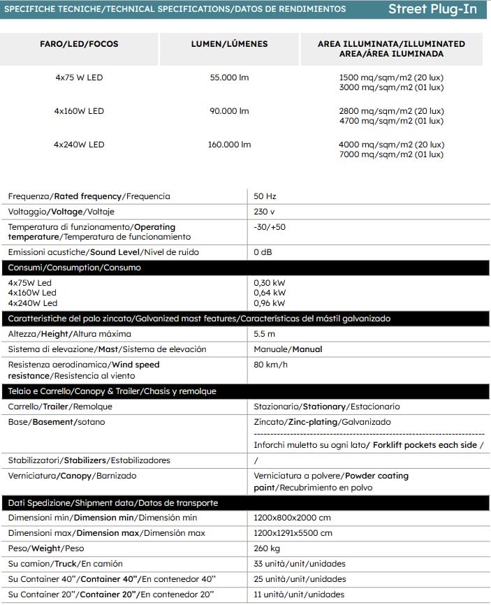 Street Plug-in is a stationary lighting tower to be connected to an energy source. A highly compact lighting tower that guarantee compactness and portability.