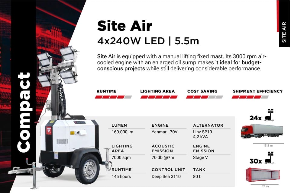 Site Air is equipped with a manual lifting fixed mast. Its 3000 rpm air-cooled engine with an enlarged oil sump makes it ideal for budget-conscious projects while still delivering considerable performance.
