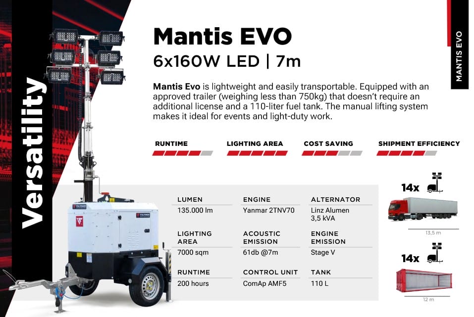 ITALTOWER LIGHTING TOWER WITH POWER GENERATOR & HYDRAULIC LIFTING SYSTEM MANTIS EVO UP TO 7M ILLUMINATED AREA 7000 SQM