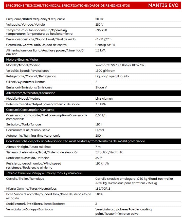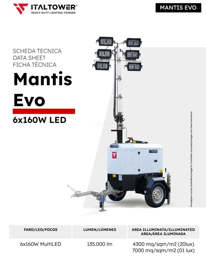 - ITALTOWER LIGHTING TOWER WITH POWER GENERATOR & HYDRAULIC LIFTING SYSTEM MANTIS EVO UP TO 7M ILLUMINATED AREA 7000 SQM