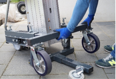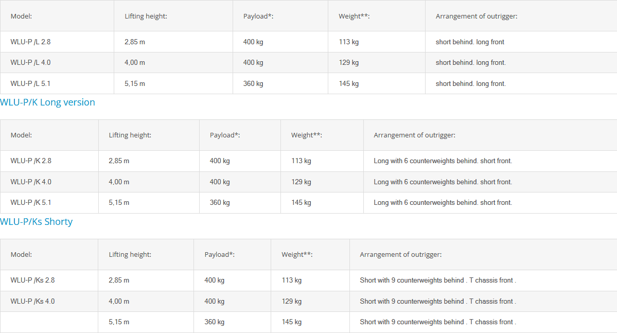 The slimmest design variant, the WLU-P /Ks, requires only a very small storage space in the working position. It can be set up quickly: Short T-chassis at the front, short outriggers at the rear, the box with nine counterweights on board ready to go. A WLU-P / K is created by replacing the short outriggers at the rear with the long ones. To conclude only six weights must be added to the box.The WLU-P / K offers a second body variant, the WLU-P / L, simply bychanging the outriggers: the two long outriggers are to be put to the front, the T-chassis to the rear. Counterweights are not necessary for this body variant. The many possible applications are convincing. There is hardly a more space-saving, simpler and faster way to work. Limited space, working overhead, lifting