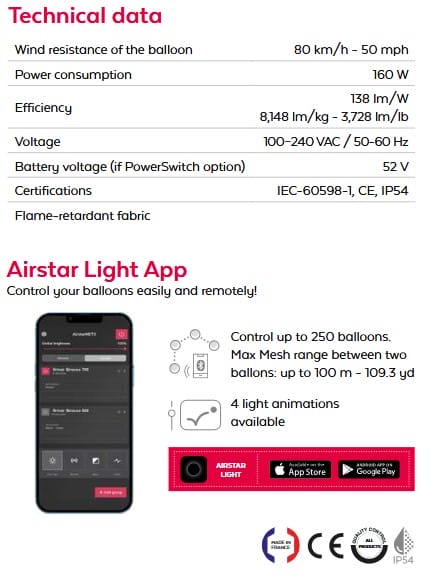 Our products are connected to each other via the Mesh network, and to the user via Bluetooth and the very simple to use Airstar app. This means that you can control up to 250 balloons, but also select various lighting effects. This technological unit is an integral part of all our lighting balloons, in particular for the Sirocco range. On the safety lighting market, our Sirocco balloons are currently the best performing and the lightest, with the lowest electricity consumption, and are the only ones to offer these specifications.