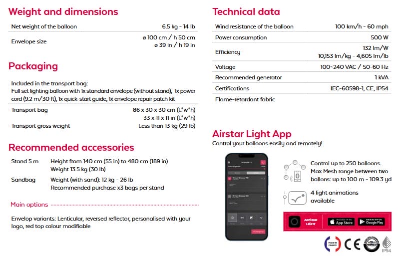 Our products are connected to each other via the Mesh network, and to the user via Bluetooth and the very simple to use Airstar app. This means that you can control up to 250 balloons, but also select various lighting effects. This technological unit is an integral part of all our lighting balloons, in particular for the Sirocco range. On the safety lighting market, our Sirocco balloons are currently the best performing and the lightest, with the lowest electricity consumption, and are the only ones to offer these specifications.