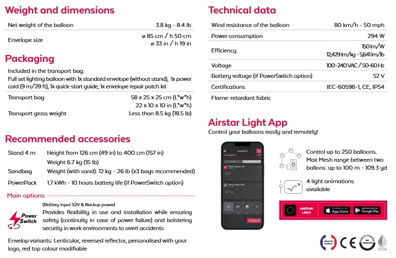 Our products are connected to each other via the Mesh network, and to the user via Bluetooth and the very simple to use Airstar app. This means that you can control up to 250 balloons, but also select various lighting effects. This technological unit is an integral part of all our lighting balloons, in particular for the Sirocco range. On the safety lighting market, our Sirocco balloons are currently the best performing and the lightest, with the lowest electricity consumption, and are the only ones to offer these specifications.