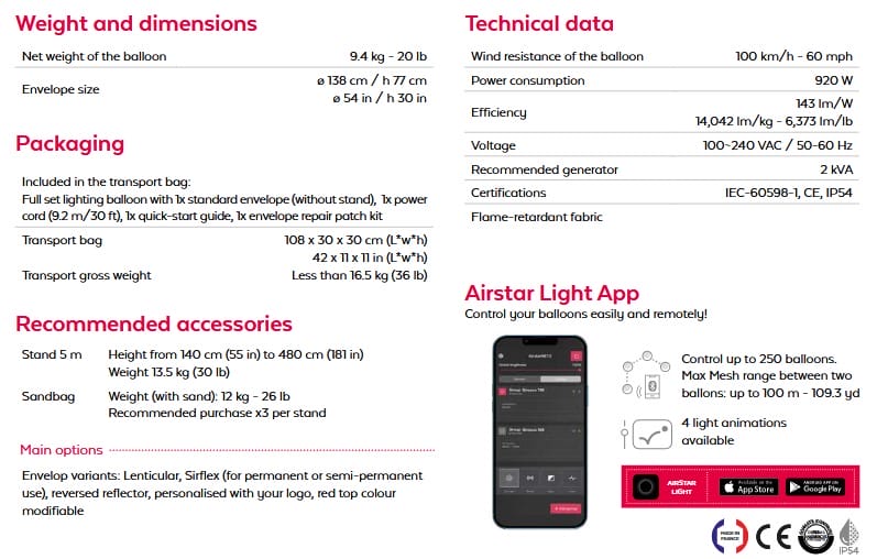 Our products are connected to each other via the Mesh network, and to the user via Bluetooth and the very simple to use Airstar app. This means that you can control up to 250 balloons, but also select various lighting effects. This technological unit is an integral part of all our lighting balloons, in particular for the Sirocco range. On the safety lighting market, our Sirocco balloons are currently the best performing and the lightest, with the lowest electricity consumption, and are the only ones to offer these specifications.