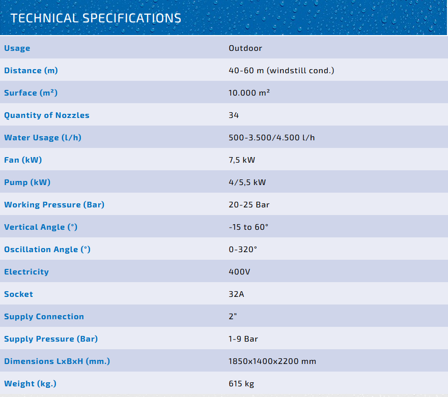 SprayCannon 90Extra-powerful automatic mist cannon with a spraying range of 90 m. The SprayCannon produces a fine mist and cleanses the air of the fin..