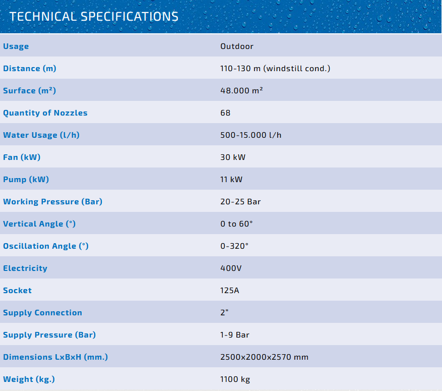 SprayCannon 90Extra-powerful automatic mist cannon with a spraying range of 90 m. The SprayCannon produces a fine mist and cleanses the air of the fin..