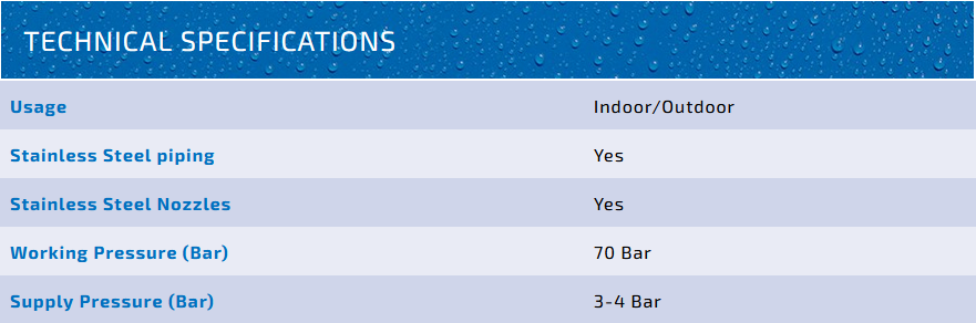A high-grade network of stainless steel pipelines will be installed at the top of your hall, which will be equipped with specially created high pressure nozzles. By increasing the water pressure up to 70 bars we will create an extremely delicate screen of fog. Any floating dust particles will clot to these droplets of water and will fall down to the ground.