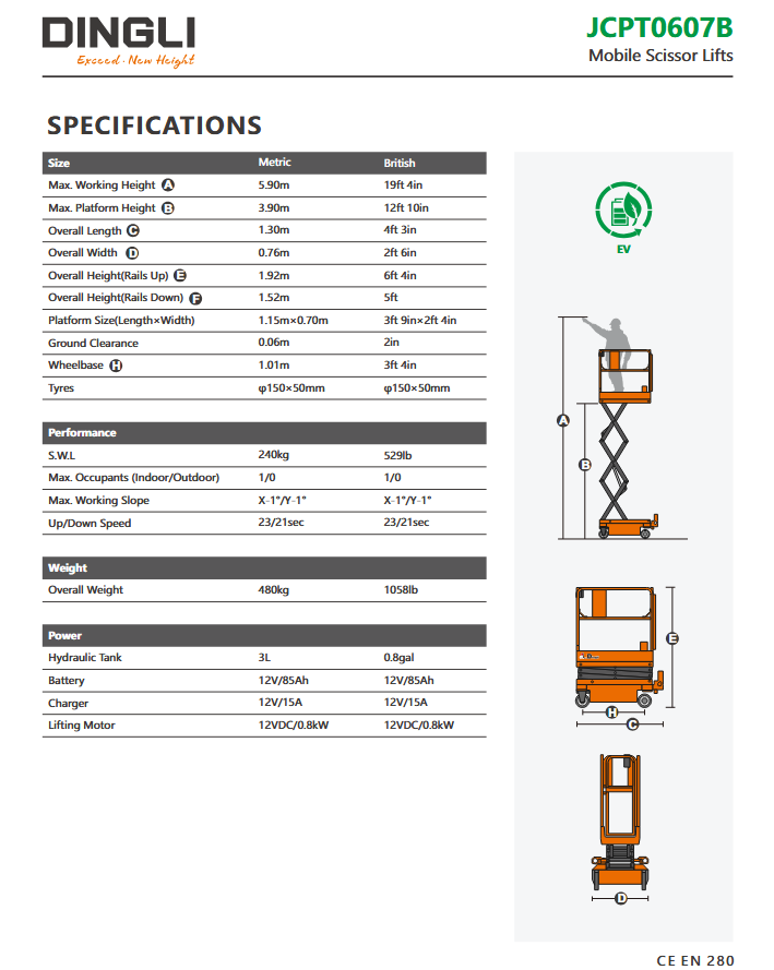 Dingli JCPT0607B | Electric scissor lift with working height 5.9 meters and lifting capacity 240 kg