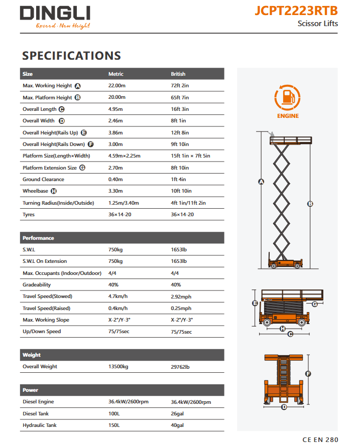 Dingli JCPT2223RTB | Diesel scissor lift with working height 22 meters and lifting capacity 750 kg