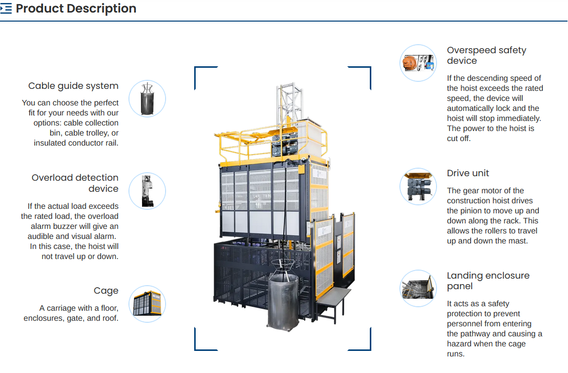 The construction hoist is a crucial piece of lifting machinery used in the construction industry, providing vertical access for operators, materials, and equipment. It is primarily used for working at heights, transporting materials, installing equipment, and performing cleaning and renovation tasks at construction sites. This essential vertical access solution is indispensable for construction projects.
