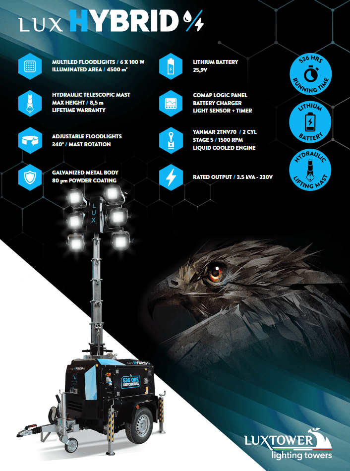 The Luxtower Hybrid Lithium combines the reliability of a diesel engine with the efficiency of lithium technology, offering a lighting tower that is: