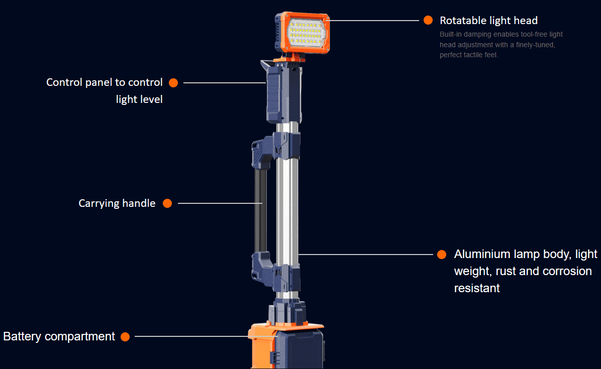 Rapid Deployment: Extend the light head to 1.4 m with a single lift for automatic locking. Tap down to reset and secure effortlessly.