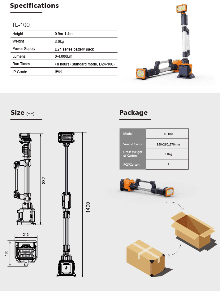 Experience ultimate convenience and powerful illumination with the TL-100 portable light tower – the world’s lightest, most versatile lighting solution for professionals and enthusiasts alike. Expand or collapse in just 1 second, making setup faster than ever.