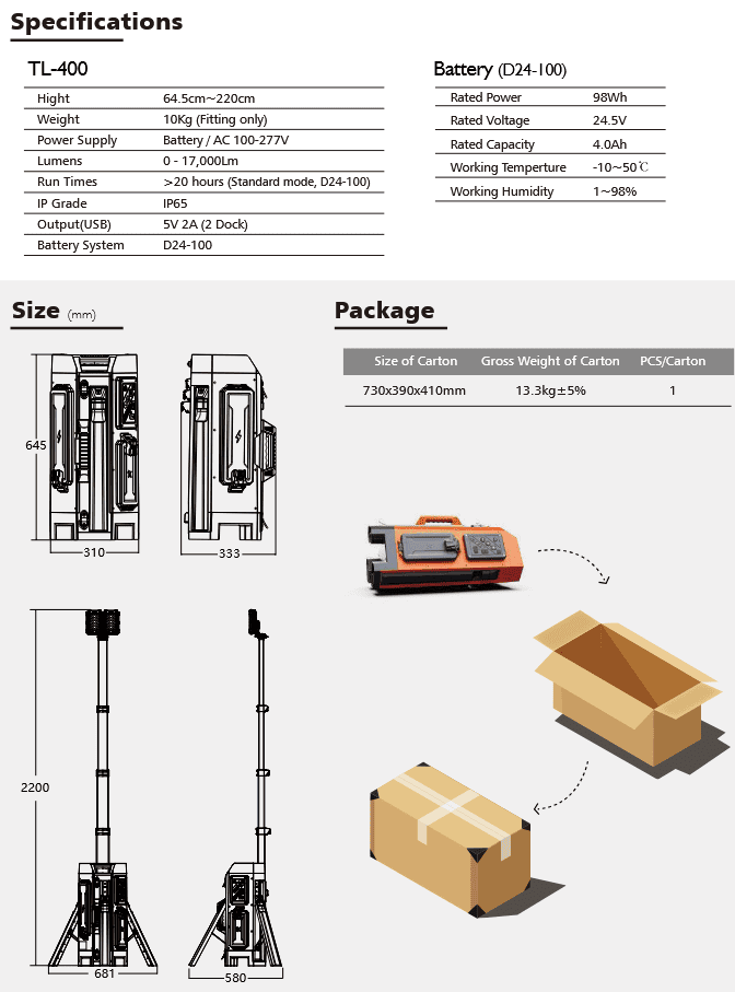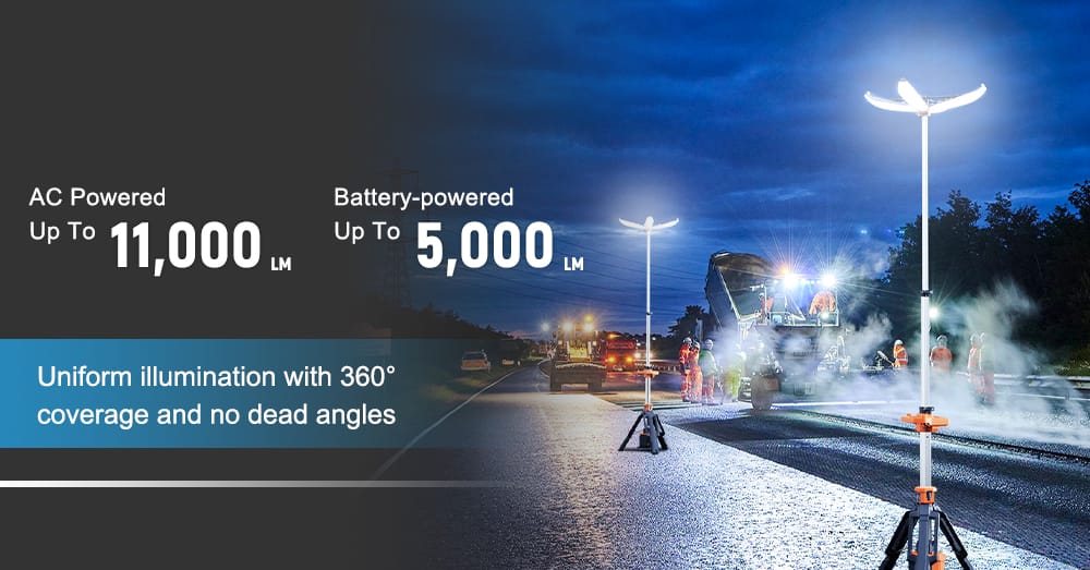 Dual Power System: Works with D24 battery packs or AC 100–277V power, delivering up to 12,000 lumens (AC) or 6,000 lumens (battery).