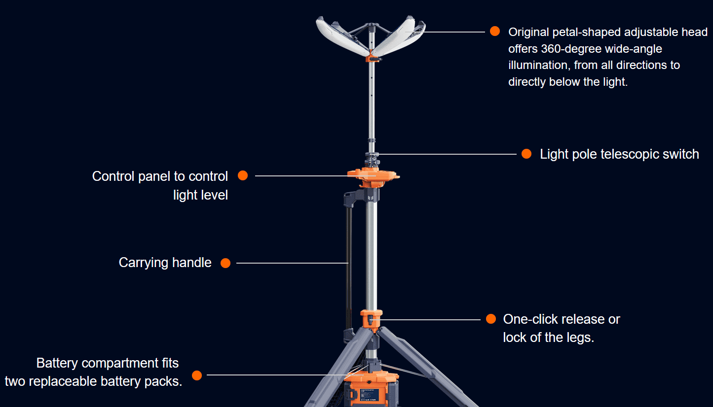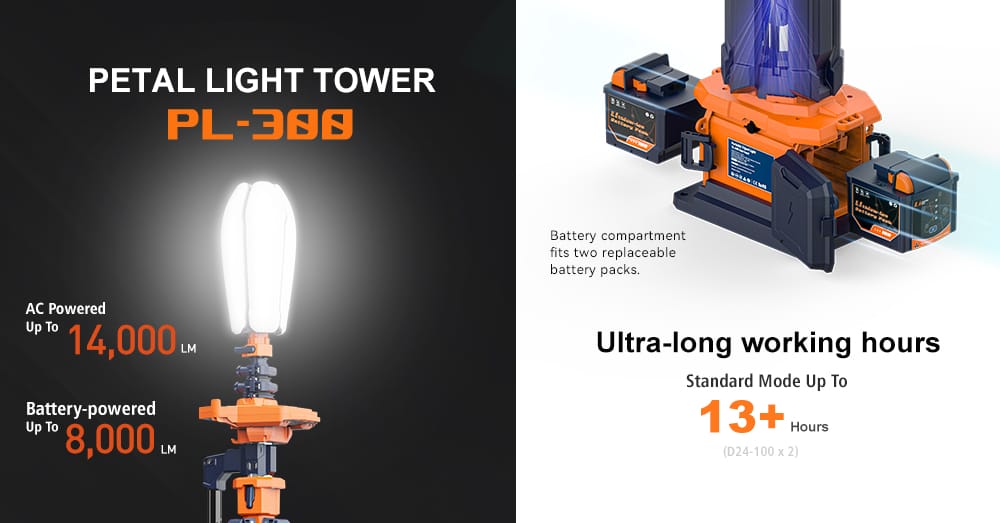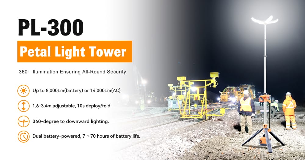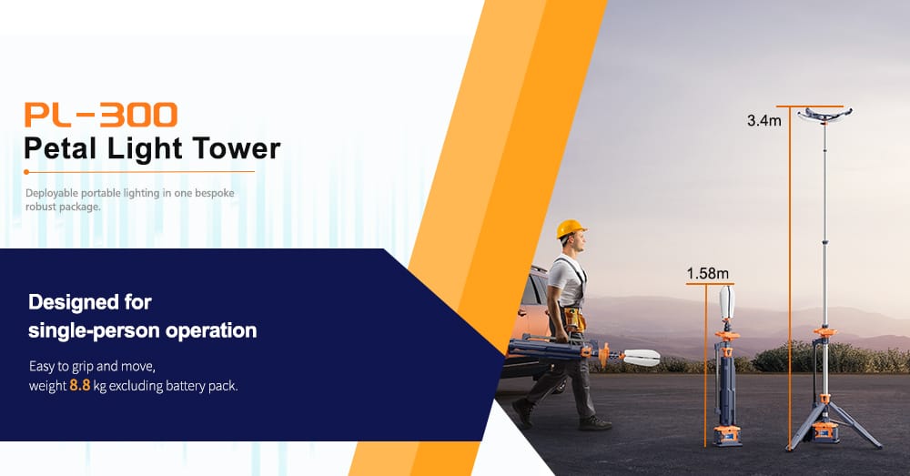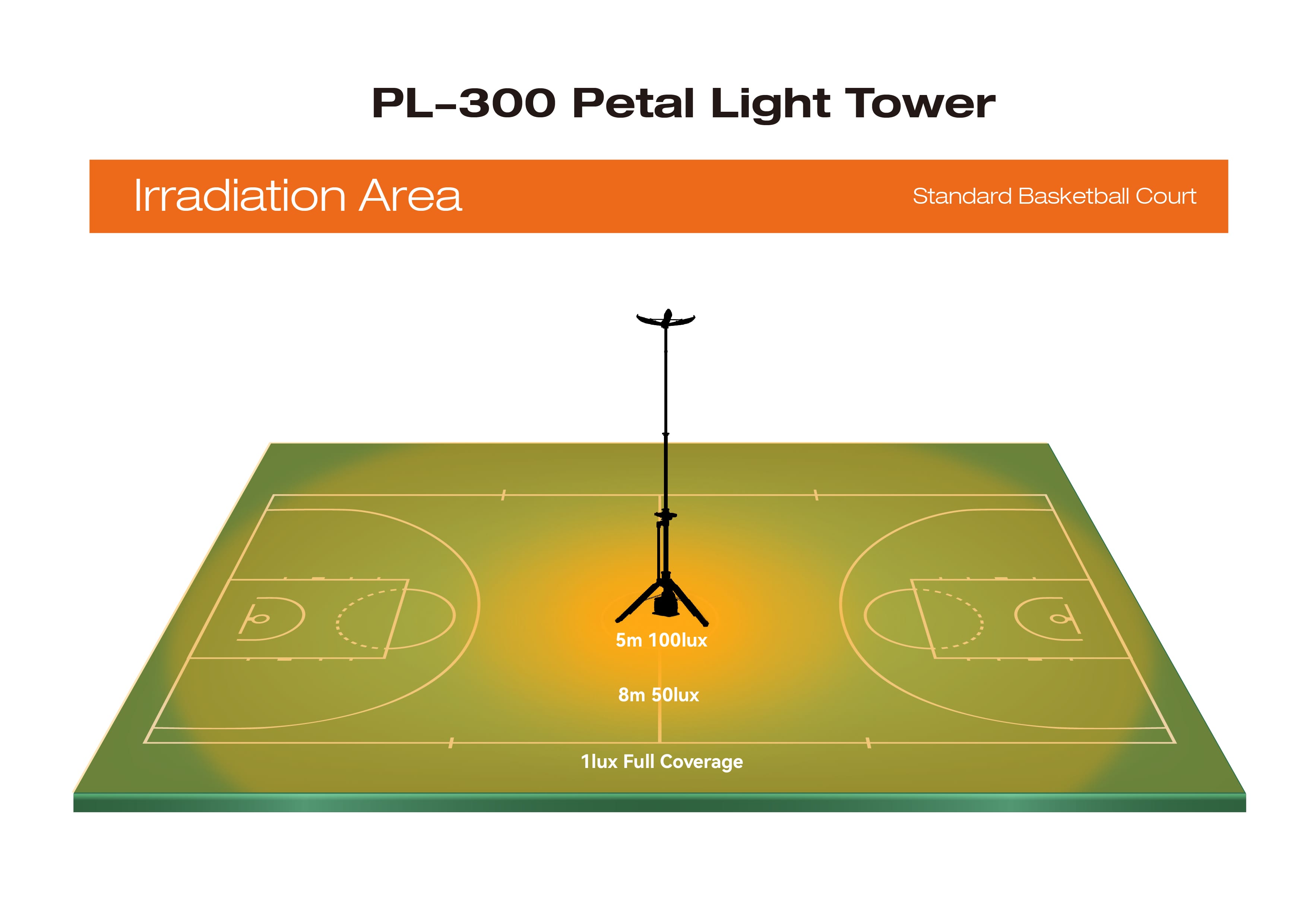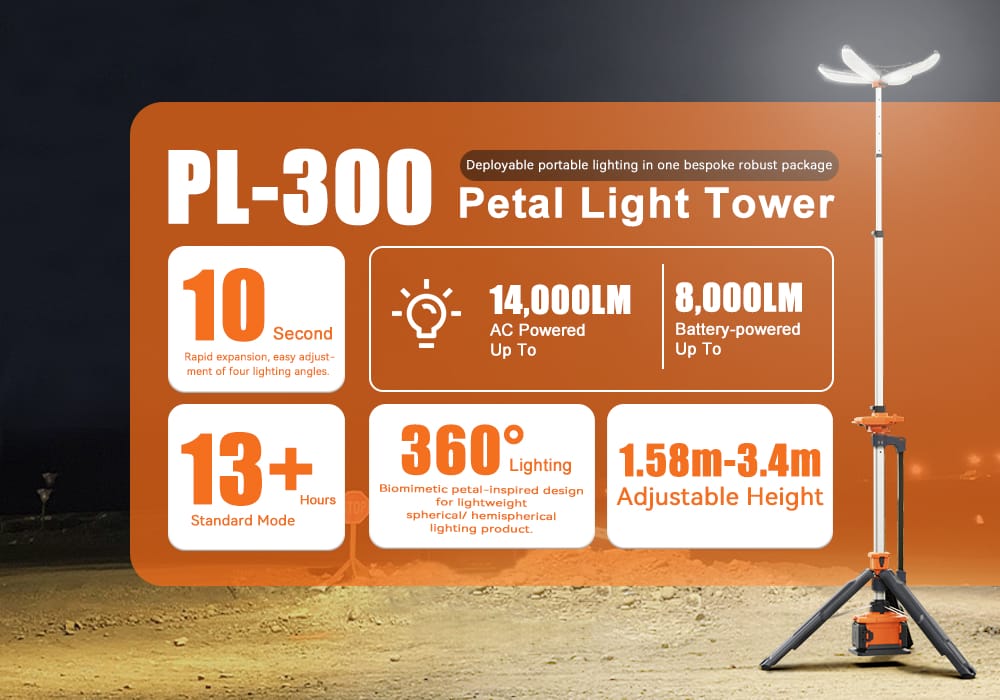 The PL-300 Petal Light Tower delivers higher brightness, extended reach, and superior stability for professional, industrial, and outdoor applications. Inspired by nature, its unique petal-shaped head provides 360° uniform illumination with exceptional balance and strength.