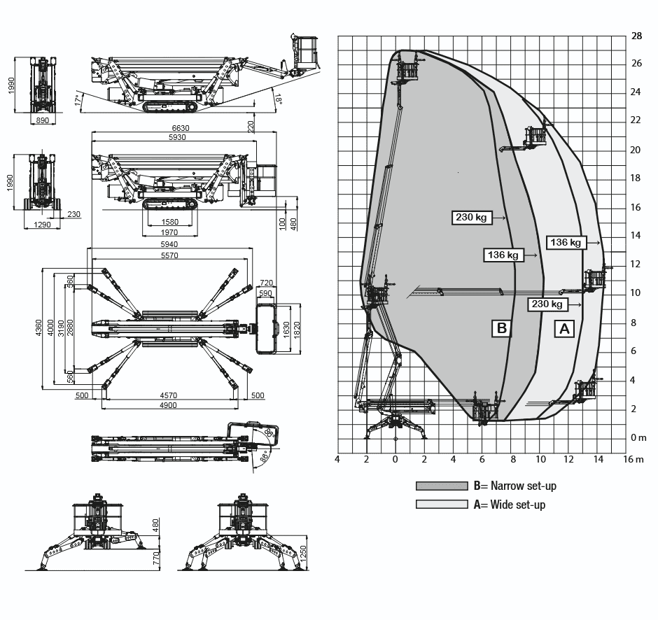 The Spider 27.14 is an articulated tracked lift equipped with a double scissor mechanism, providing an impressive 10 metres of up-and-over clearance. Weighing just 5000 kg, the Platform Basket Spider 27.14 reaches a working height of 27 metres. With a single operator in the basket (136 kg), it achieves up to 14.4 metres of outreach; with a 230 kg load, the maximum outreach is 12.7 metres.