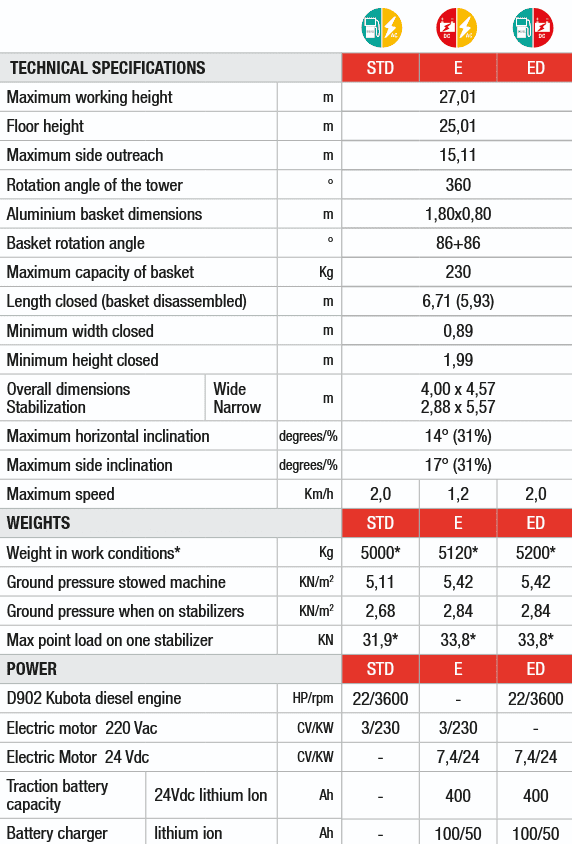 Extremely compact, the machine requires only 88 cm of width in its stowed position, allowing it to pass through standard residential doors. Stabilization is fully automatic, and side outreach is automatically managed across the 360° working envelope, based on basket load and stabilization mode.