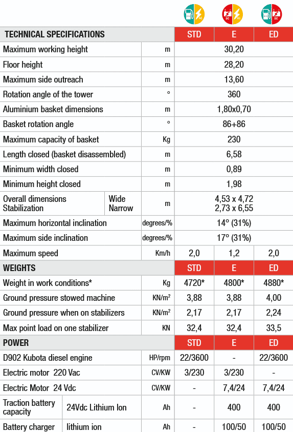 It is equipped with a Kubota combustion engine and, for quiet and eco-friendly operation, fast-charging lithium-ion batteries that allow use in any working condition — even while charging. Offering lithium-ion batteries as an alternative to traditional lead-acid models reflects Platform Basket’s response to market demand for a more sustainable and advanced power source (e.g. airports, shopping centres, museums).