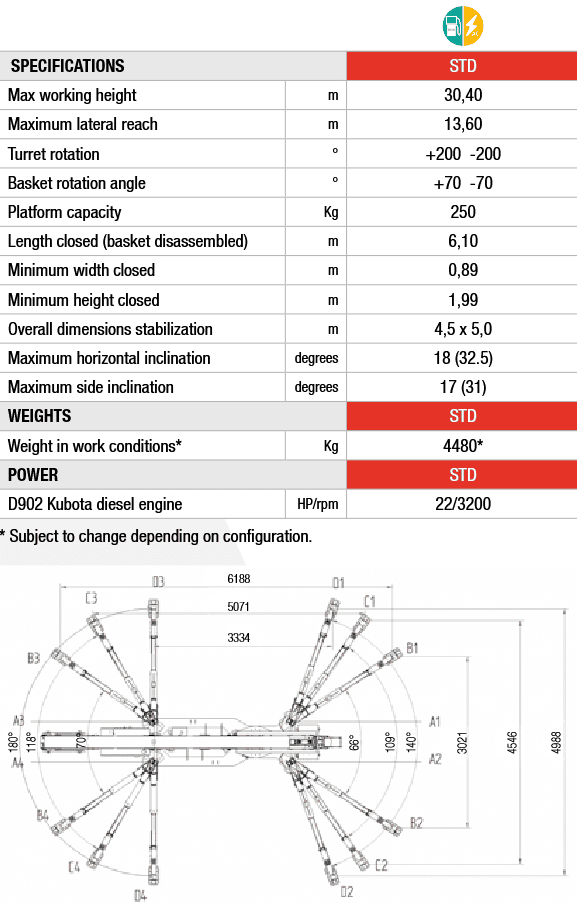 30.4 m working height and 13.6 m lateral outreach
